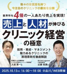 10月13日(祝)、株式会社Legaseedにて「売上と人材が伸びるクリニック経営の極意」というテーマで、同社代表取締役 近藤 悦康様とともに理事長が講演しました。